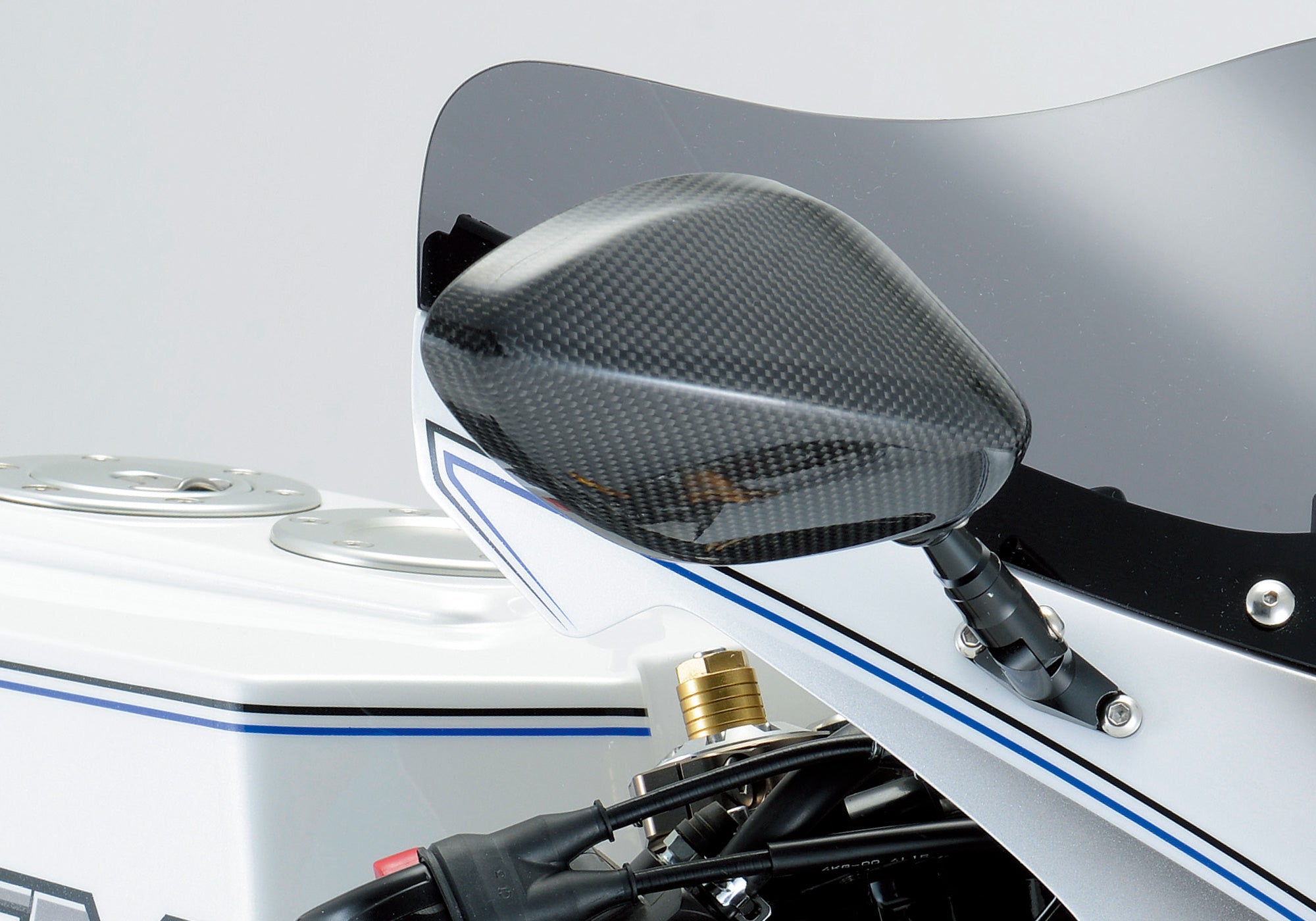 社外製カーボンミラーをカウルにフィットさせるコンパクトサイズのベースプレート。