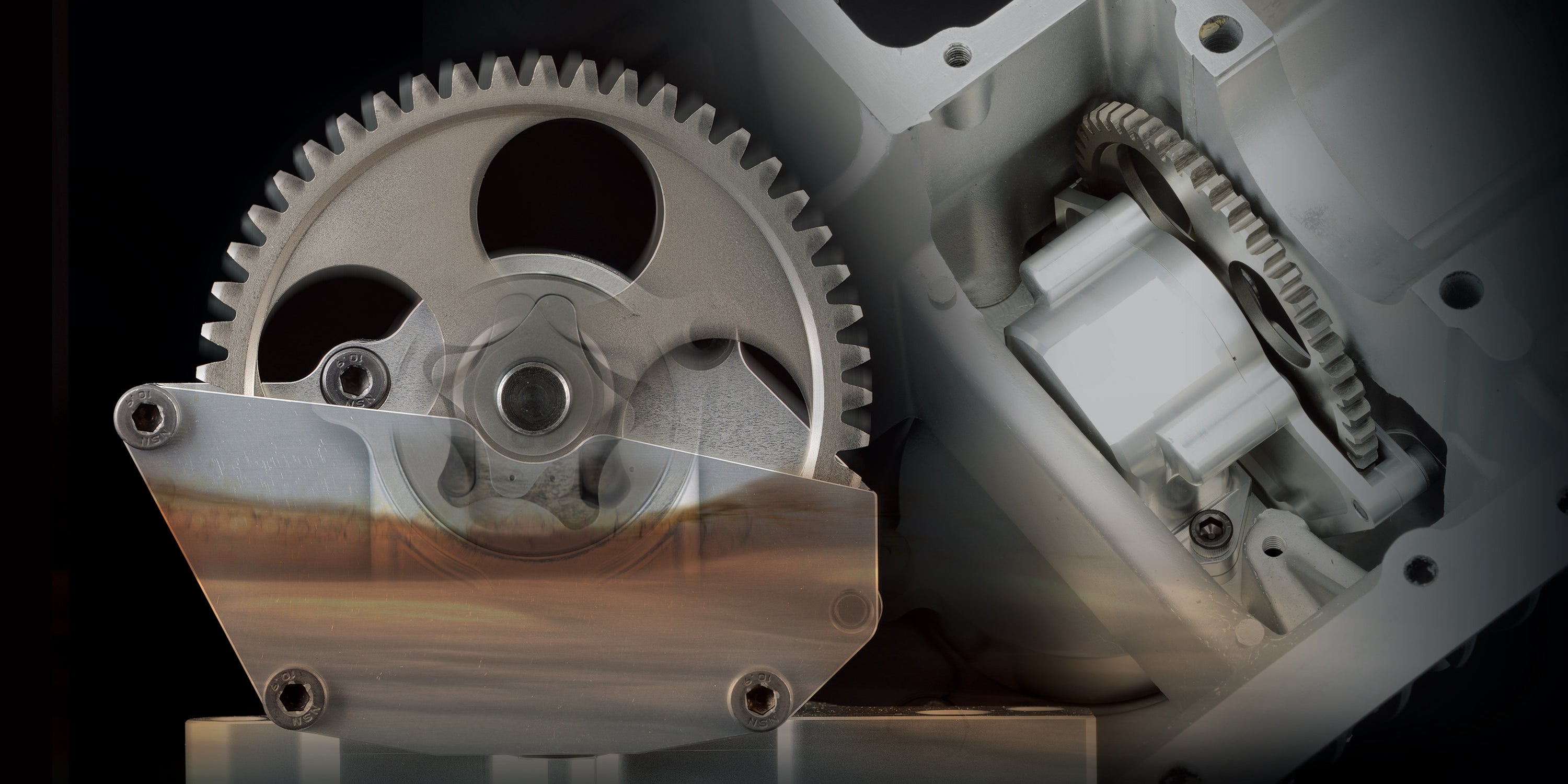 Z系のオイルポンプギヤは、エンジンオイルの油面に差し掛かった位置にあり、ギヤの高速回転によって気泡が発生するキャビテーションを常に起こしています。 ギヤ式ポンプは、すぐ下のオイルポンプ吸込口から気泡が大量に流入し、ギヤ間を通過する際に発生する懐圧によって、軸部にダメージを発生させます。またシリンダーヘッドに上がるラインはもちろん、オイルクーラーへの循環も常に気泡が混入するため、油圧が不規則なうえ、冷却効率も著しく落ちています。ハイプレッシャーオイルポンプは、ギヤカバーによってギヤ回転で発生するキャビテーションを抑える消泡構造で、トロコイドローターの高性能と相まって理想的なオイル循環を実現させています。