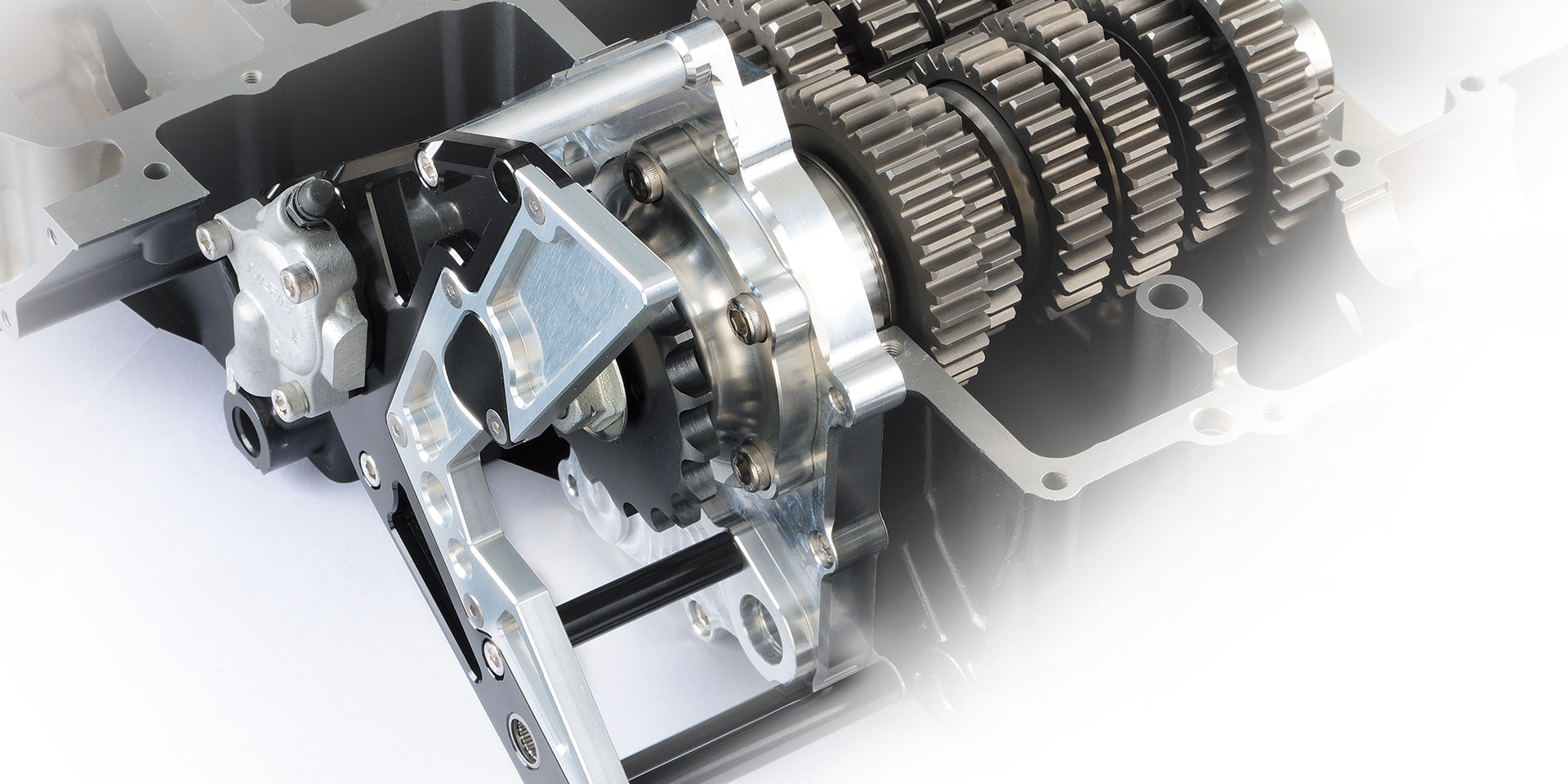 EVOシステムはZ系でリアタイヤを17インチワイド化した際、オフセットスプロケットを使用せずフラットなスプロケットのまま大幅にチェーンラインをオフセット可能にする革新的構造。 NEW 6速クロスミッションに合わせてEVOシステム最大の特徴であるロングカウンターシャフトも新造。ロングカウンターシャフトを保持するツーピースミッションカバーは強度&剛性を確保。リニューアルに合わせてNITRO RACING油圧クラッチレリーズプレートKITが付属されたフルパッケージで新登場。