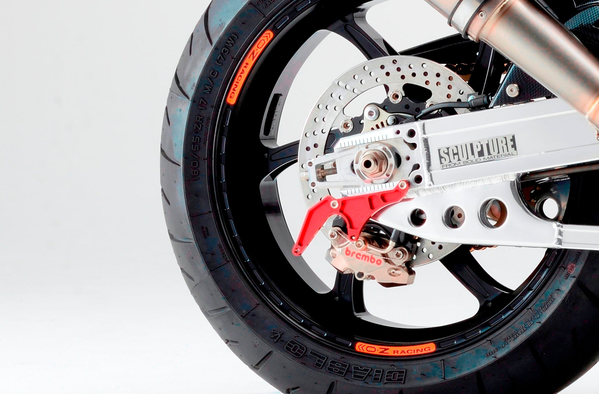 リアタイヤに、より大きなトラクションをかけたいという考えから設定したスイングアーム長。短いスイングアームによるショートホイールベースのメリットよりもある程度の長さを持たせることで得られるコントロール感(操縦感)にウェイトを置いたスカルプチャースイングアーム。