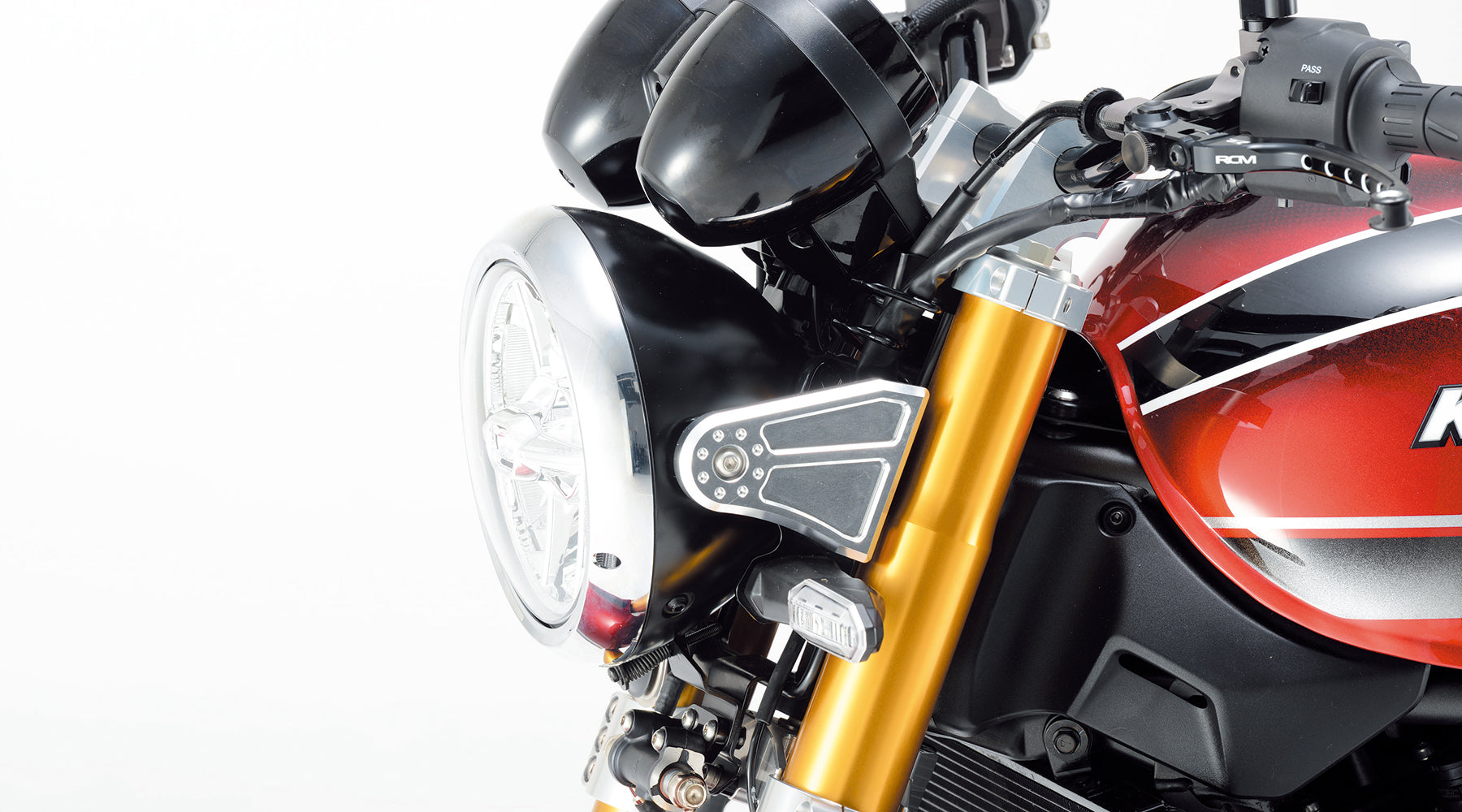 Z900RSのノーマルヘッドライトステーに被せる形で取付けできるボルトオンライトステーKIT。ノーマルウインカー対応専用ウインカーステー付属。